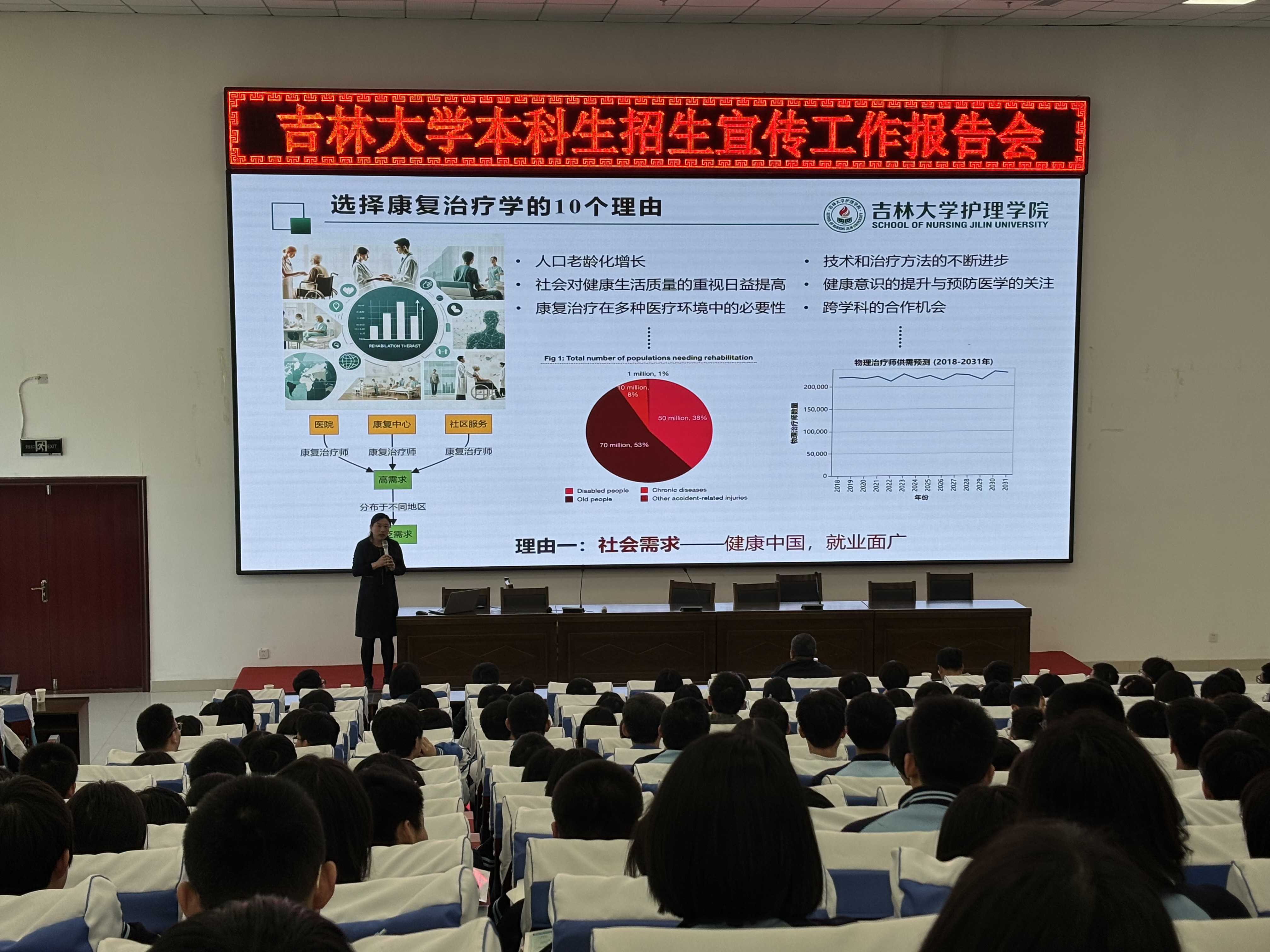 的建设情况,并作了题为《康复:让生命更加精彩》的科普报告,以康复治疗学专业为例,通过生动的案例和丰富的数据,列举报考康复治疗学的“十大理由”,让同学们对康复治疗学专业有了更加全面和深入的了解。