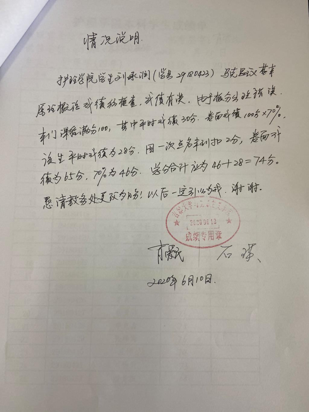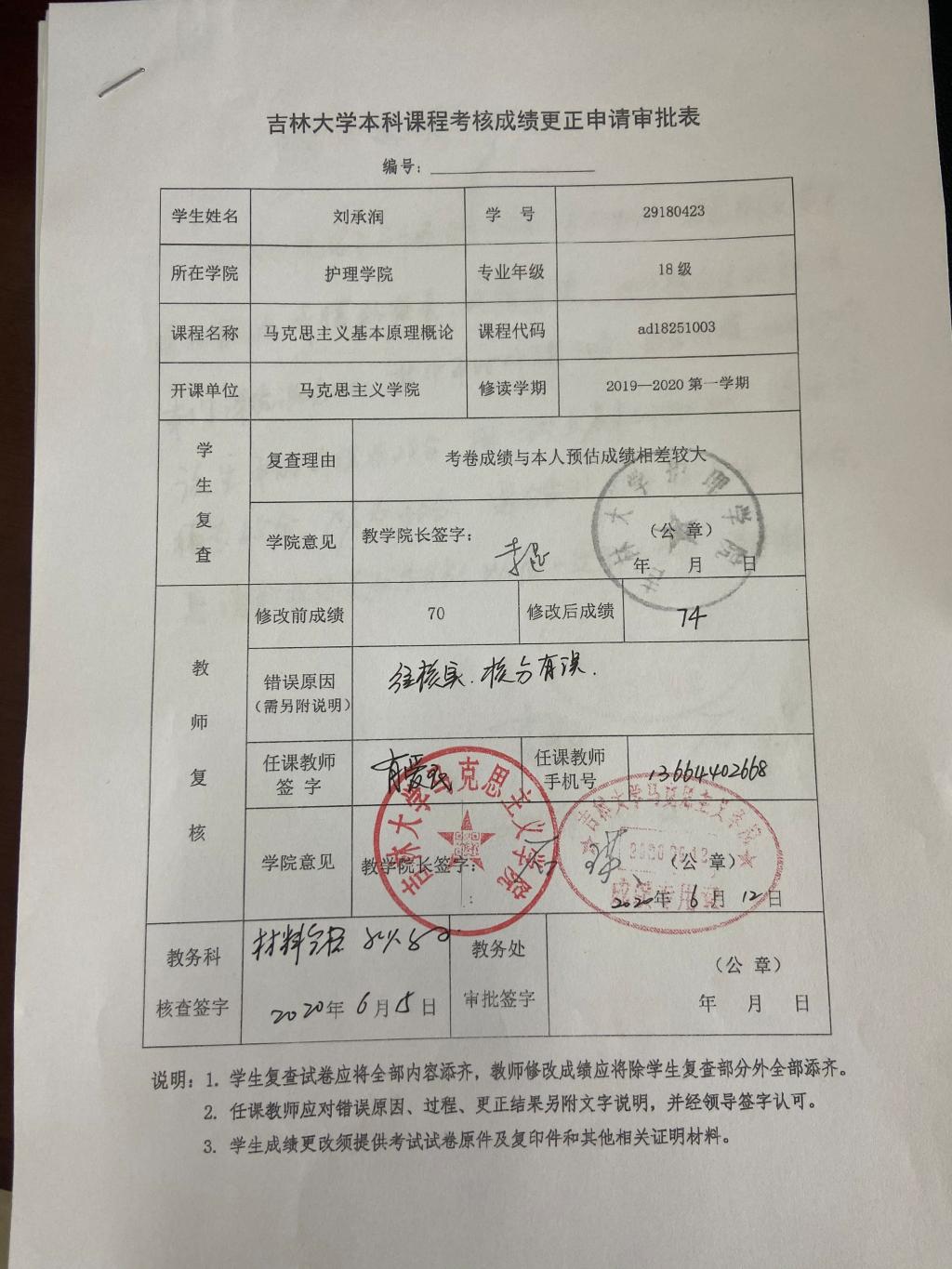 根据《关于进一步明确本科生课程考核等有关问题的通知》(校教字〔2018〕47号)文件有关精神,现对av解说 2018级刘承润同学(学号:29180423)2019-2020-1学期课程成绩更正如下: