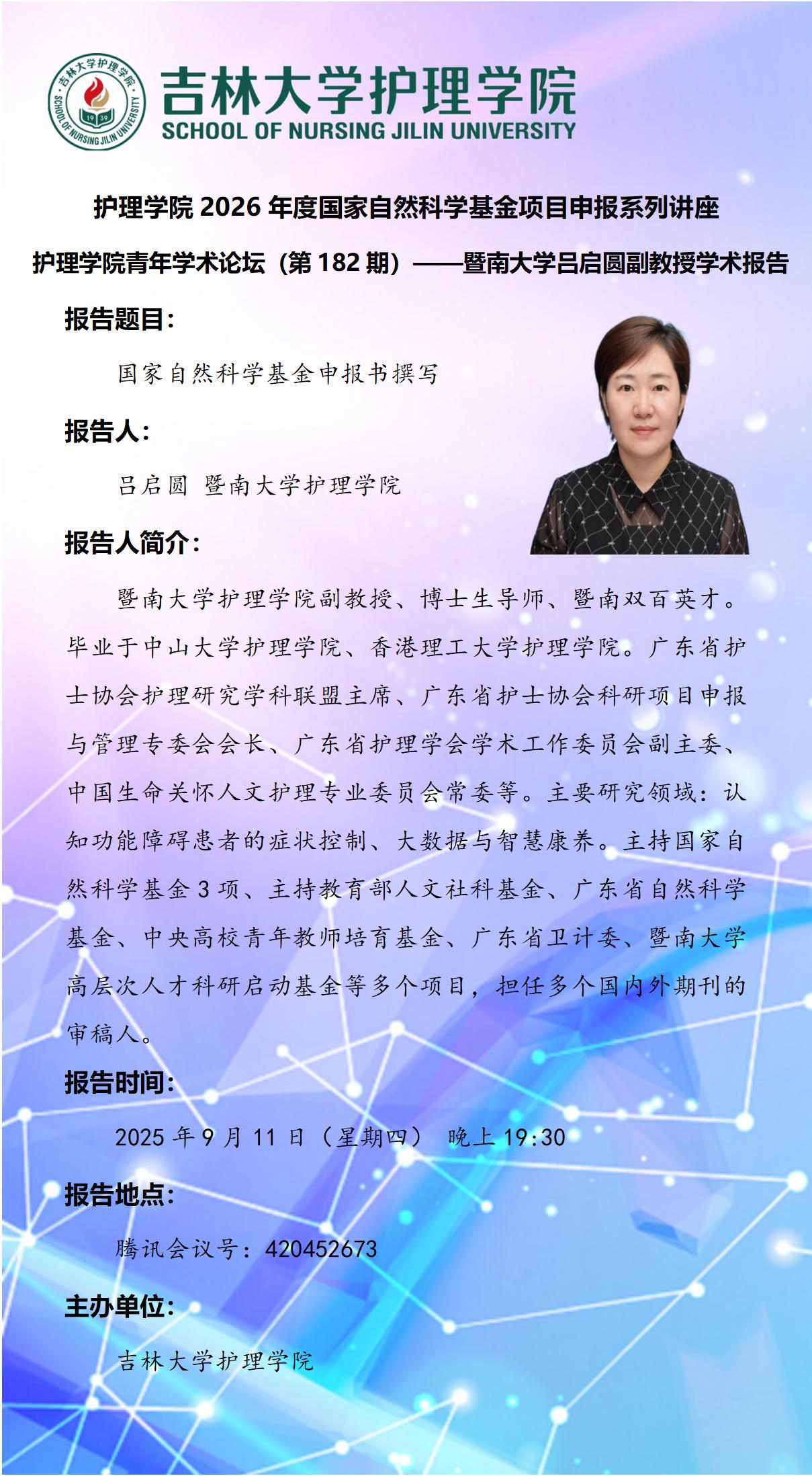 。广东省护士协会护理研究学科联盟主席、广东省护士协会科研项目申报与管理专委会会长、广东省护理学会学术工作委员会副主委、中国生命关怀人文护理专业委员会常委等。主要研究领域:认知功能障碍患者的症状控制、大数据与智慧康养。主持国家自然科学基金3项、主持教育部人文社科基金、广东省自然科学基金、中央高校青年教师培育基金、广东省卫计委、暨南大学高层次人才科研启动基金等多个项目,担任多个国内外期刊的审稿人。