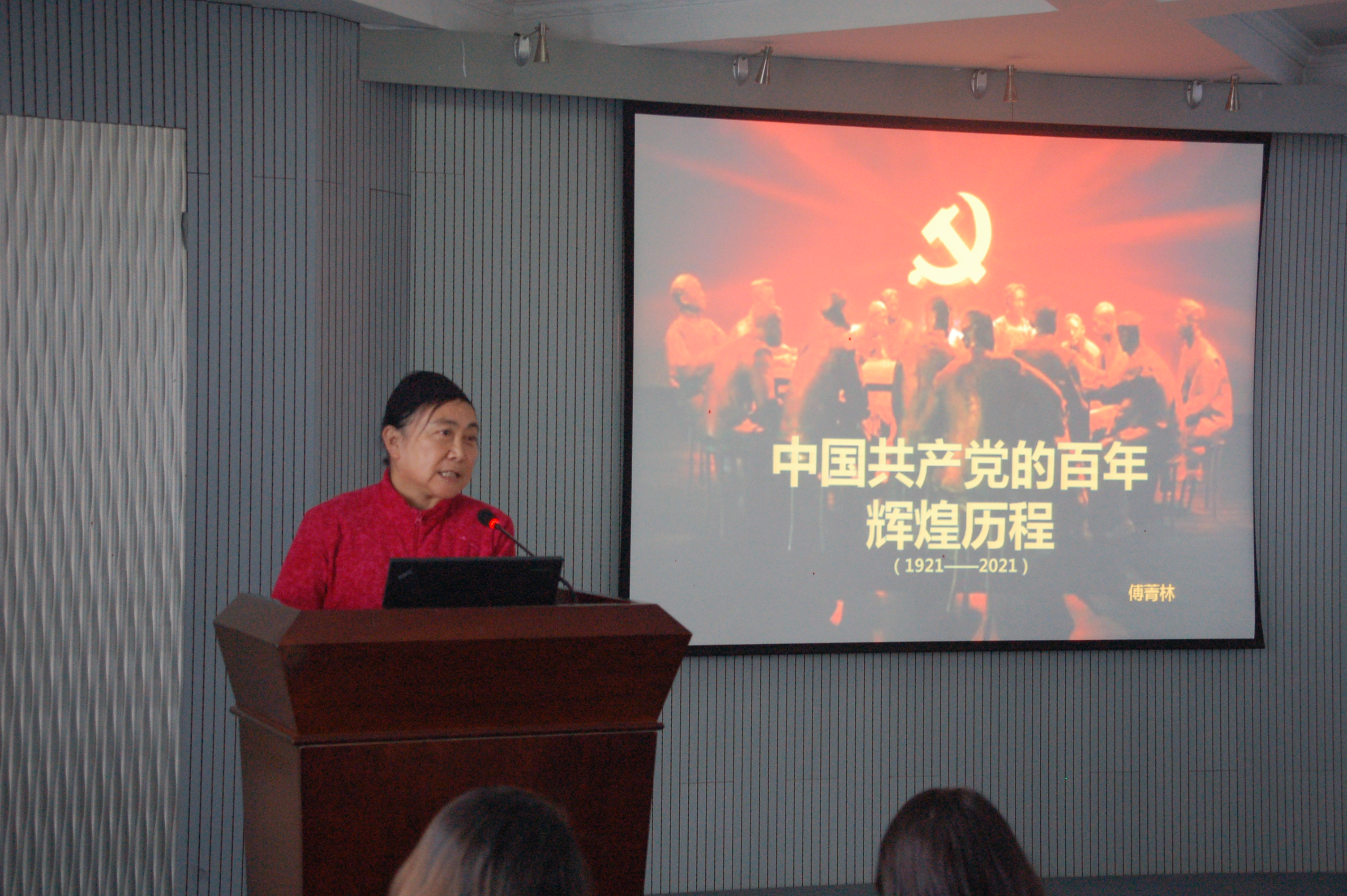 傅菁林教授以《中国共产党的百年辉煌历程》为主题,从党史发展脉络及学习意义、中国共产党对中国人民的卓越贡献、中国共产党为什么“能”三方面阐述了中国共产党的百年辉煌历程,重点阐述了中国共产党对中国人民的卓越贡献。傅菁林教授在报告中列举了大量史实,通过横向和纵向比较,让大家了解到新时代党的面貌、国家的面貌、人民的面貌、军队的面貌、中华民族的面貌发生了前所未有的变化,这些变化,深刻影响了中国,也深刻影响了世界;中国共产党团结带领中国人民实现了中华民族从富起来到强起来的伟大飞跃,迎来了实现中华民族伟大复兴的光明前景,进一步论述了:只有中国共产党才能救中国、只有中国共产党才能发展中国,坚持中国共产党的领导是中国人民的选择和历史的选择。
