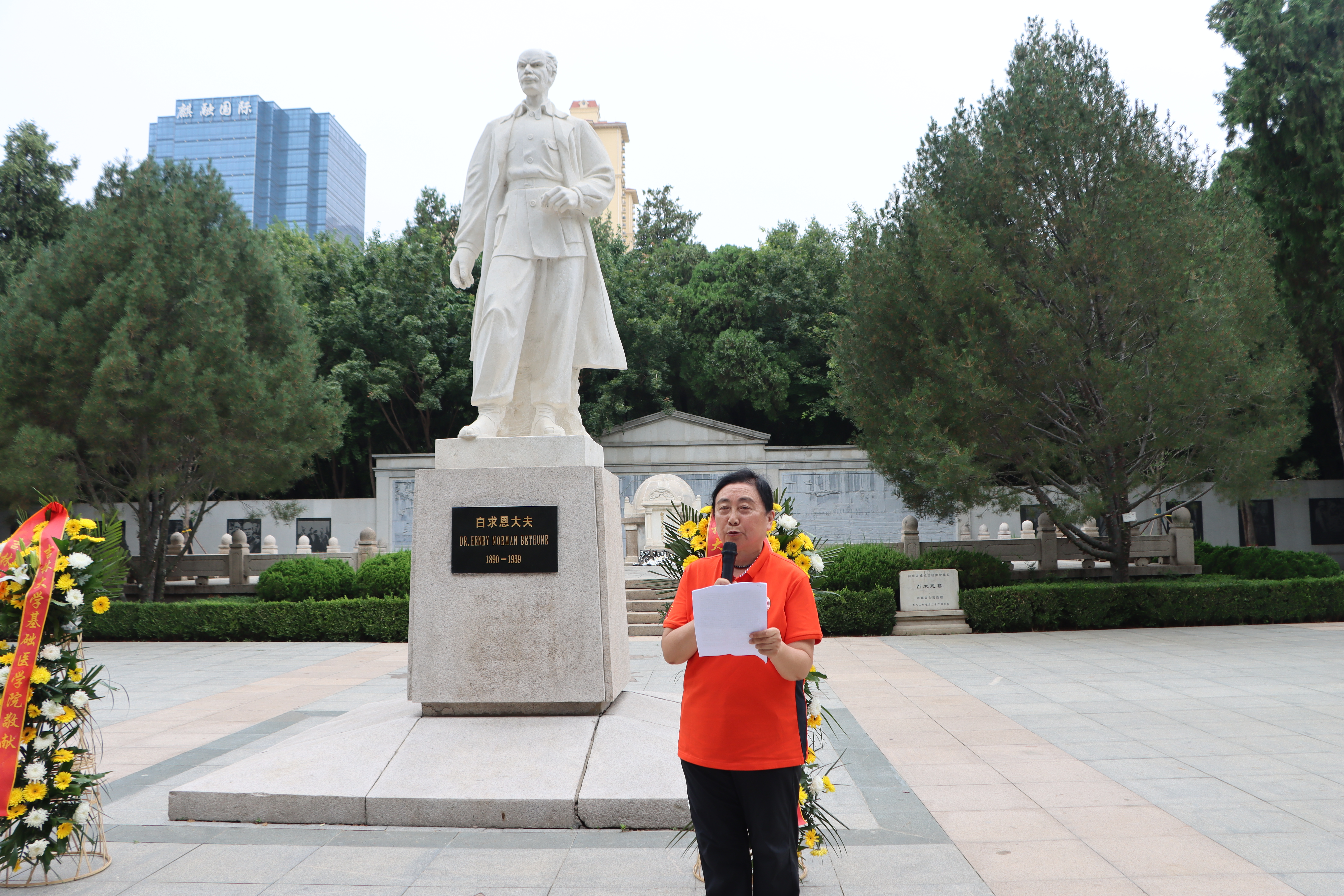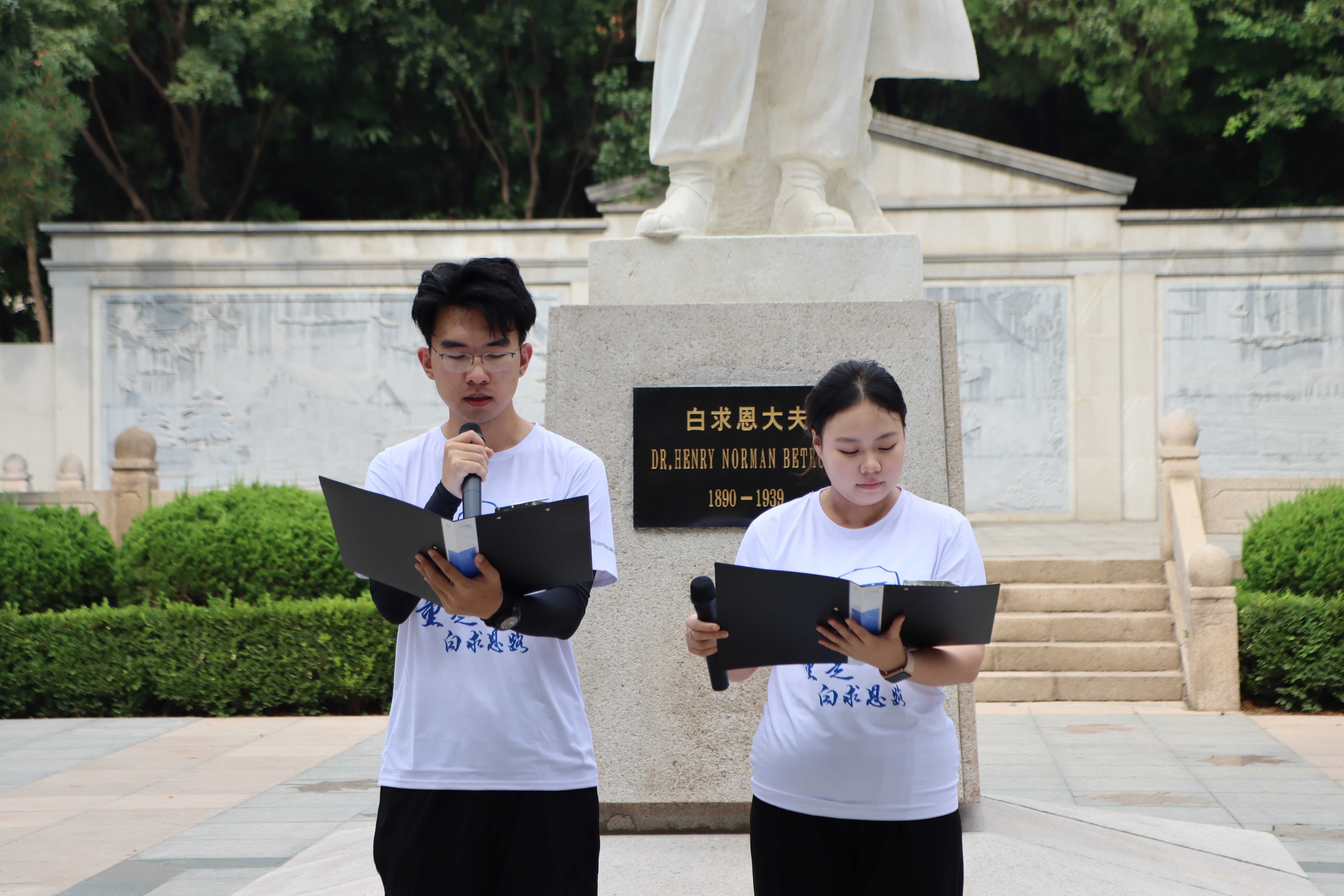 与基础医学院学生代表共同朗诵《纪念白求恩》,在声声朗诵中抒发对白求恩同志的敬佩与怀念,表达弘扬和践行白求恩精神的决心。随后,学生代表向白求恩墓敬献花篮,队员们依次向白求恩墓献花。公共卫生学院学生代表发言,表明作为一名医学生,要坚定信念信心,传承发扬国际主义精神。av解说