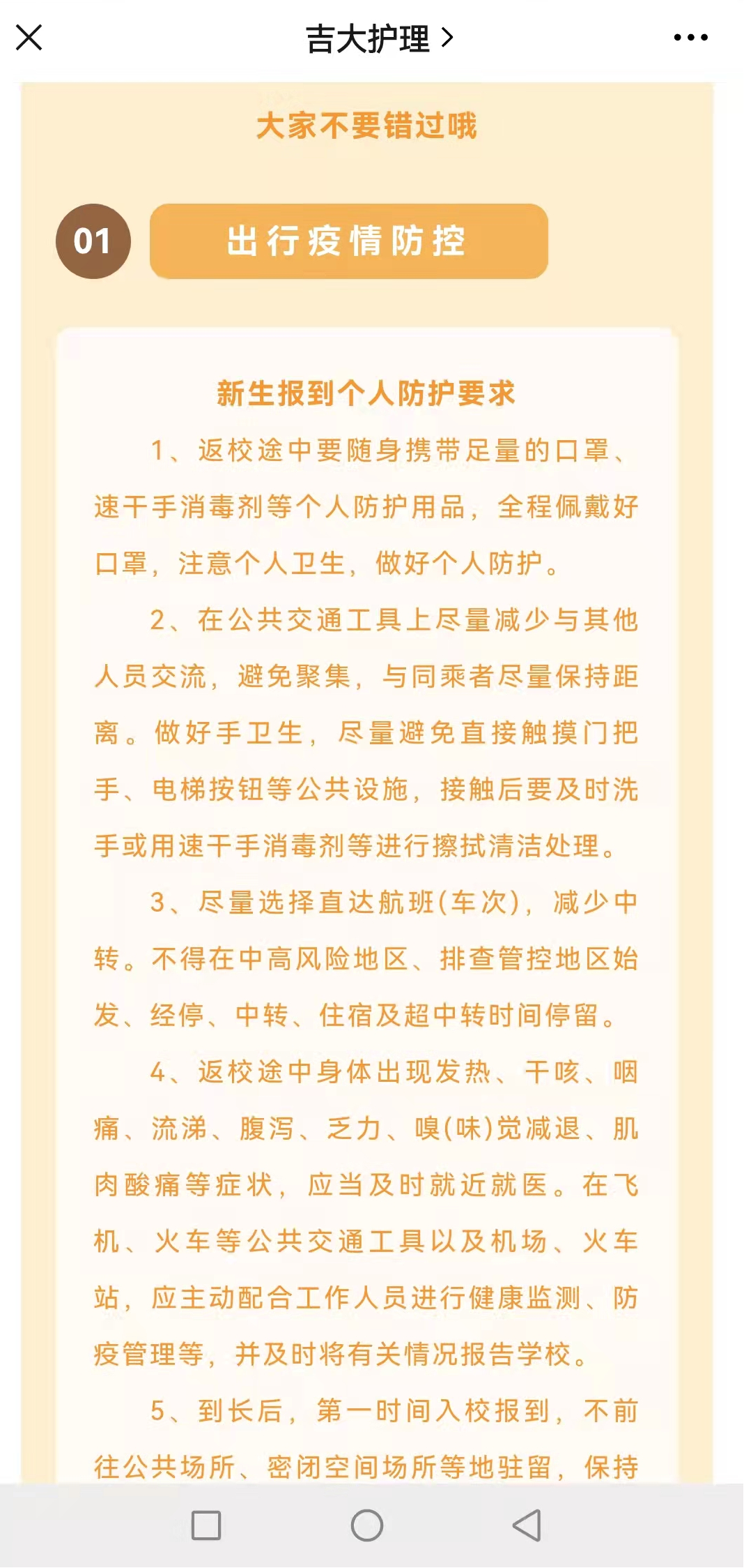 运用新媒体平台开展新生防疫知识宣传和防护指导工作,帮助同学们加强个人防护意识,引导学生正确掌握基本疫情防控措施,确保新生平安来校报到。新生可通过吉大护理公众号新生入学指南系列,全方位了解新生报到的各项准备工作,更加清楚地了解最便捷的报到路线、乘坐校园小巴温馨提示等。除此之外,新生报到的必备材料、报到各项要求也详细地包含在推送中。不仅帮助新生提前做好报到准备工作,还能够帮助新生进一步了解av解说